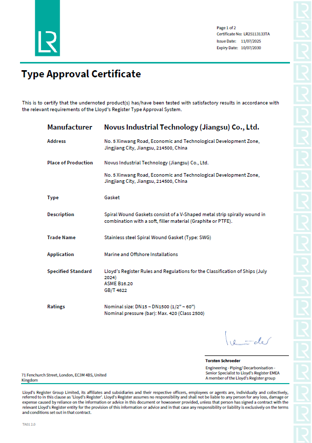 近期,我司金属缠绕垫片(Spiral Wound Gasket)产品顺利取得由英国劳氏船级社(LR,全称Lloyd’s Register)批准颁发的型式认可证书,证书有效期为:11/07/2025~10/07/2030。
